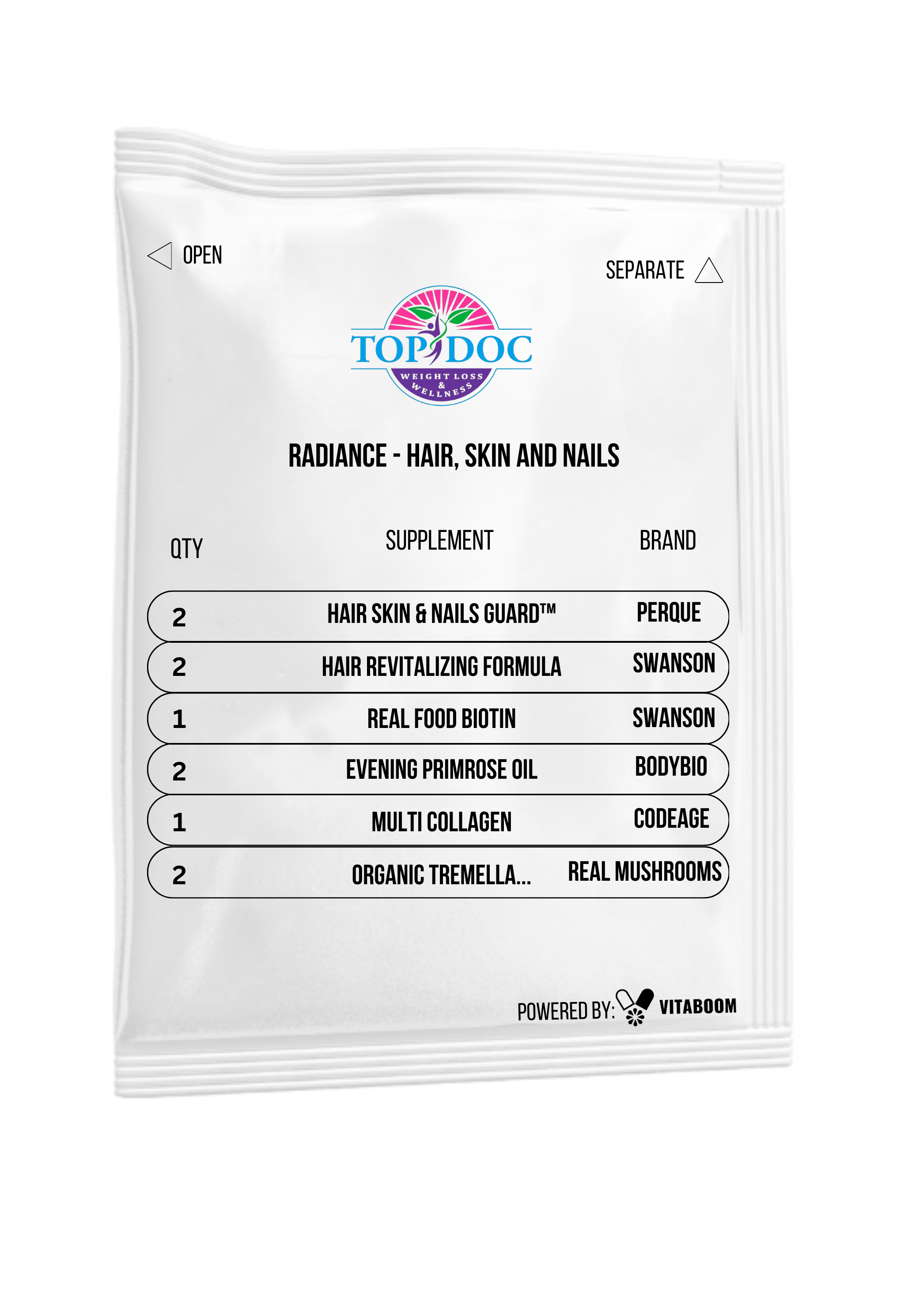 Nourish your beauty from the inside out with the TopDoc Radiance Stack. This powerful blend of premium supplements supports vibrant hair, glowing skin, and strong nails. Packed with collagen, biotin, and revitalizing botanicals, it’s your all-in-one solution for ultimate radiance and vitality.